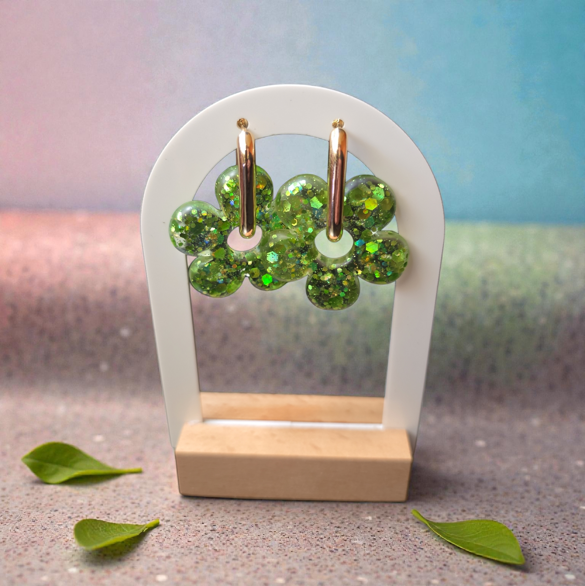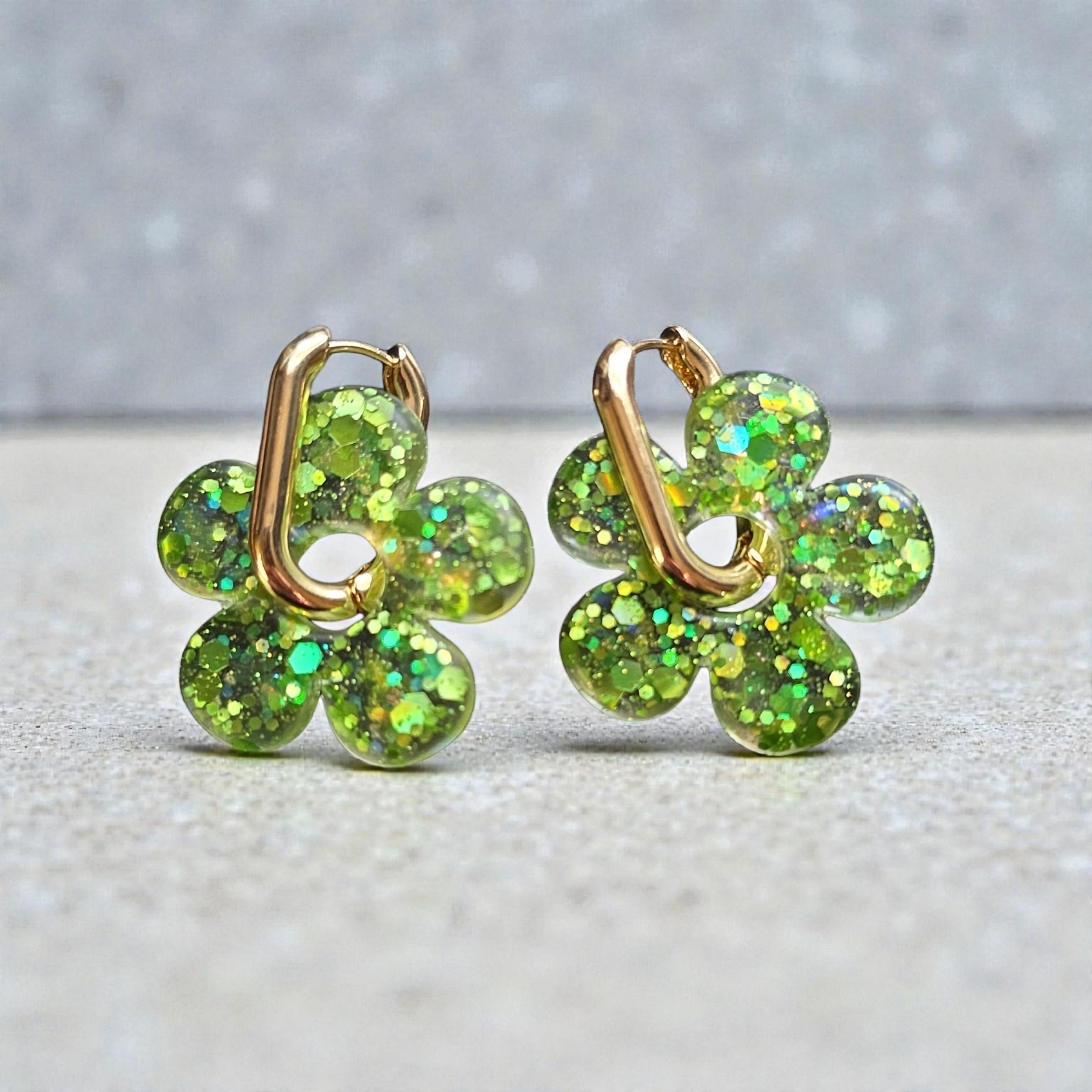 Vibrant and luminous, ZEPPLINE LED earrings stand out with their openwork floral shape featuring five petals and a shimmering green hue, sprinkled with glitter that sparkles with luminous reflections. Their brilliance captures the light intensely and brings a fresh, joyful, and modern touch to your style.