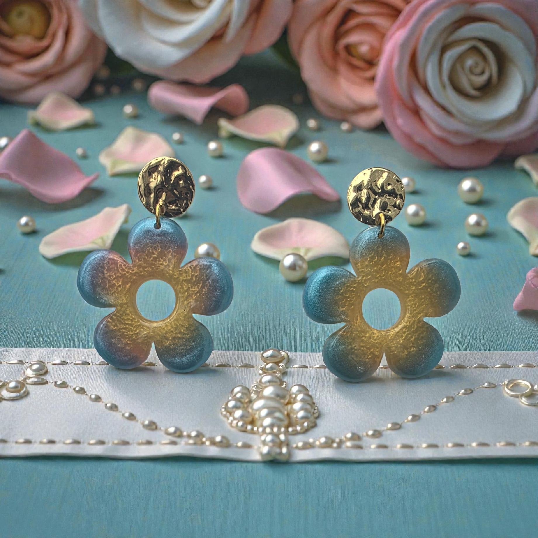 Radiant and delicate, the ZEPPLINE LED earrings stand out with their openwork floral shape featuring five petals and a subtle blue and gold gradient. Their subtly glittered and frosted finish elegantly captures the light, adding a luminous and poetic touch to your style.