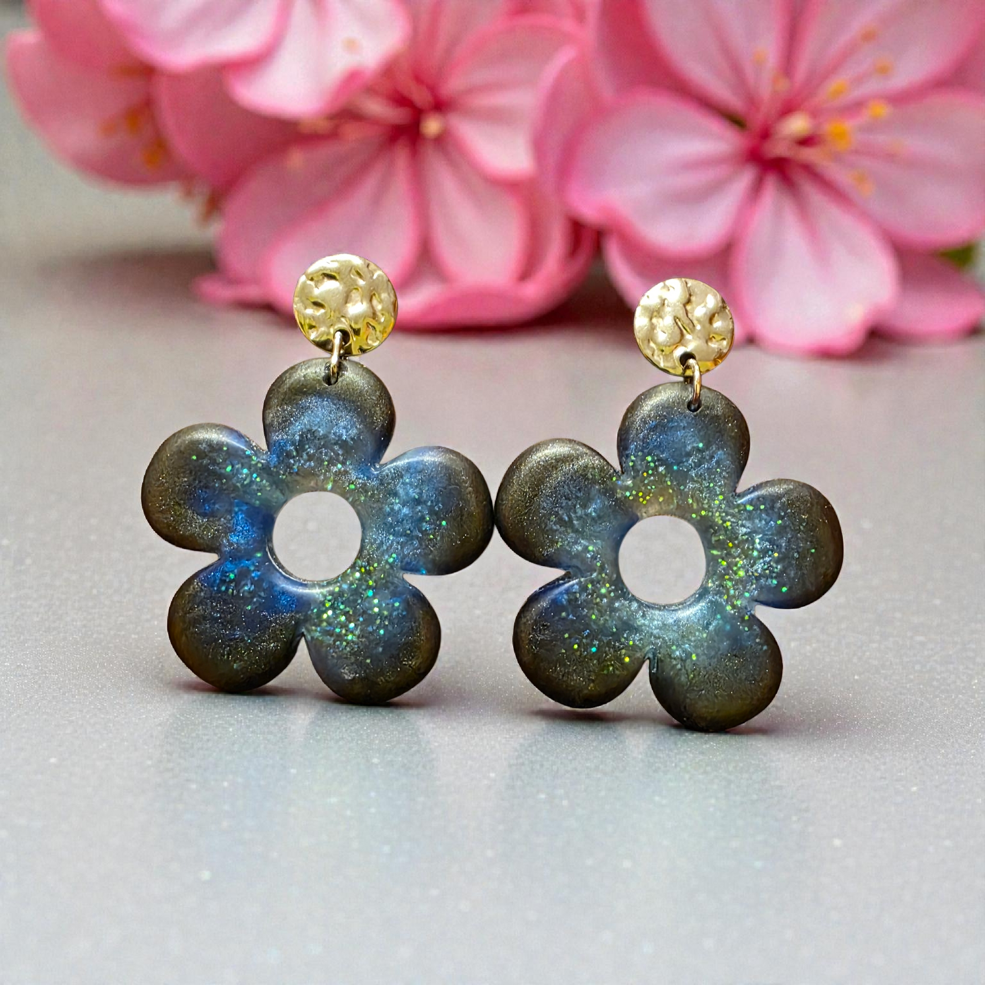 Mysterious and luminous, the ZEPPLINE LED earrings captivate with their openwork floral pattern and deep reflections. Their dark hue with hints of midnight blue and iridescent green, delicately glittered, offers a subtle and elegant play of light that evolves with movement.