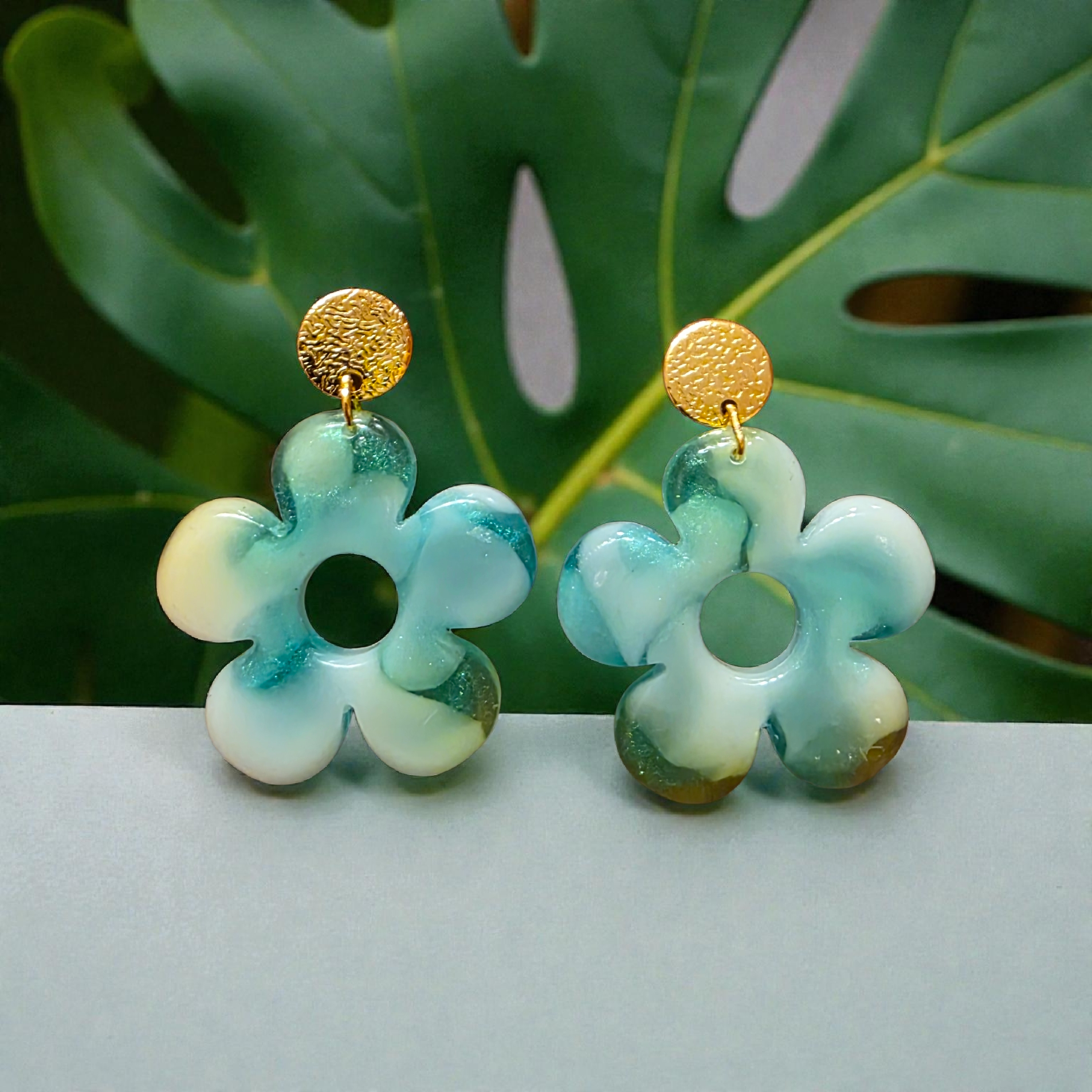 ZEPPLINE LED Earrings – Marbled aqua flower on gold discs