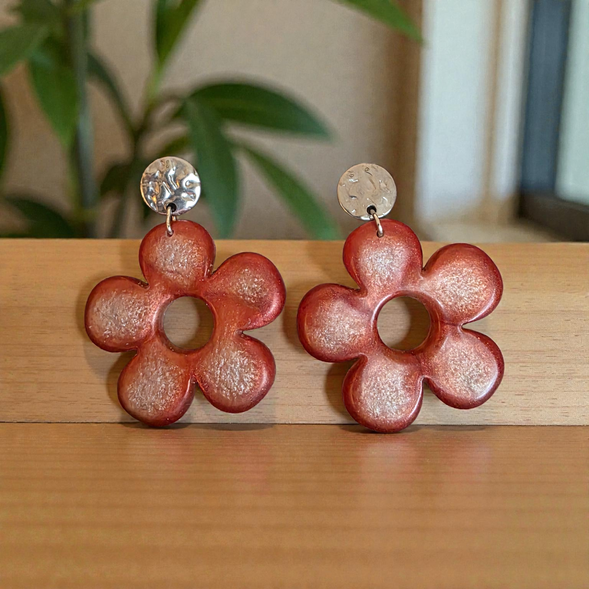 Warm and elegant, the ZEPPLINE LED earrings are distinguished by their openwork floral shape with five petals and their terracotta hue with delicate pearlescent reflections. Their subtly glittery finish softly captures the light and adds a luminous and sophisticated touch to your style.