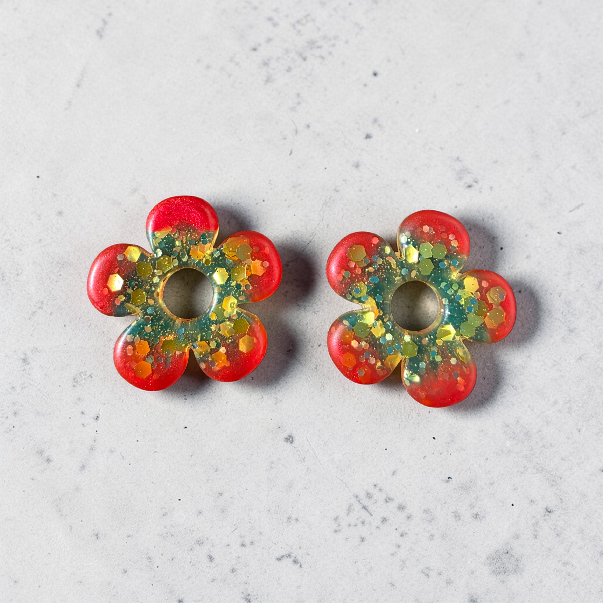 ✨Vibrantes et lumineuses, les boucles d’oreilles LED ZEPPLINE séduisent par leur forme fleur ajourée à cinq pétales et leur trou central caractéristique. Réalisées en résine rouge éclatant mêlée à des nuances vertes profondes et parsemées de paillettes dorées et scintillantes, elles captent la lumière avec intensité et apportent une touche audacieuse, festive et originale à toutes les tenues.