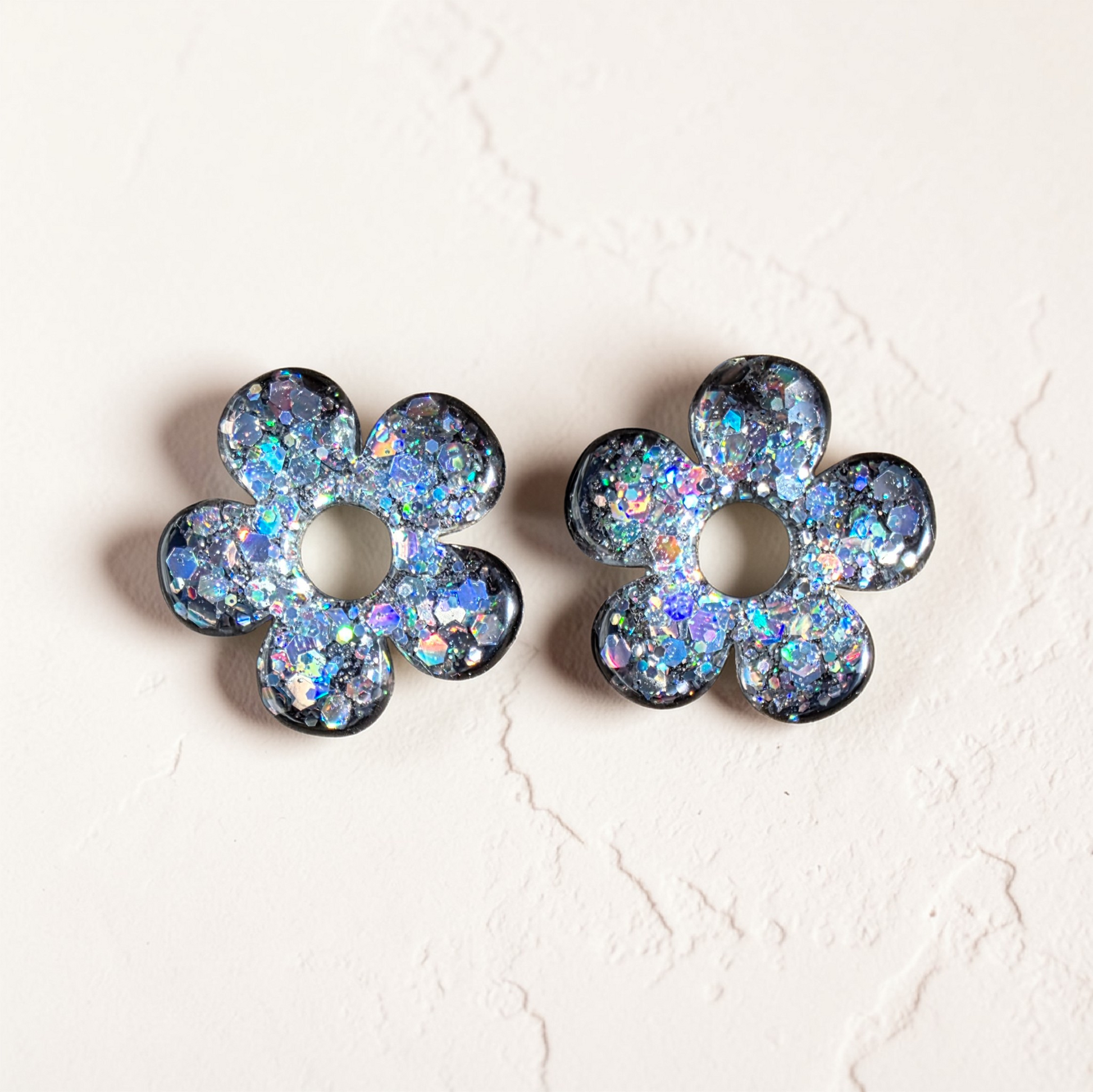 Élégantes et lumineuses, les boucles d’oreilles LED ZEPPLINE se déclinent ici dans une version argentée aux éclats holographiques. Leur forme fleur ajourée à cinq pétales, avec le trou central signature, offre un design moderne et structuré, tandis que les multiples reflets bleutés, rosés et nacrés captent intensément la lumière.