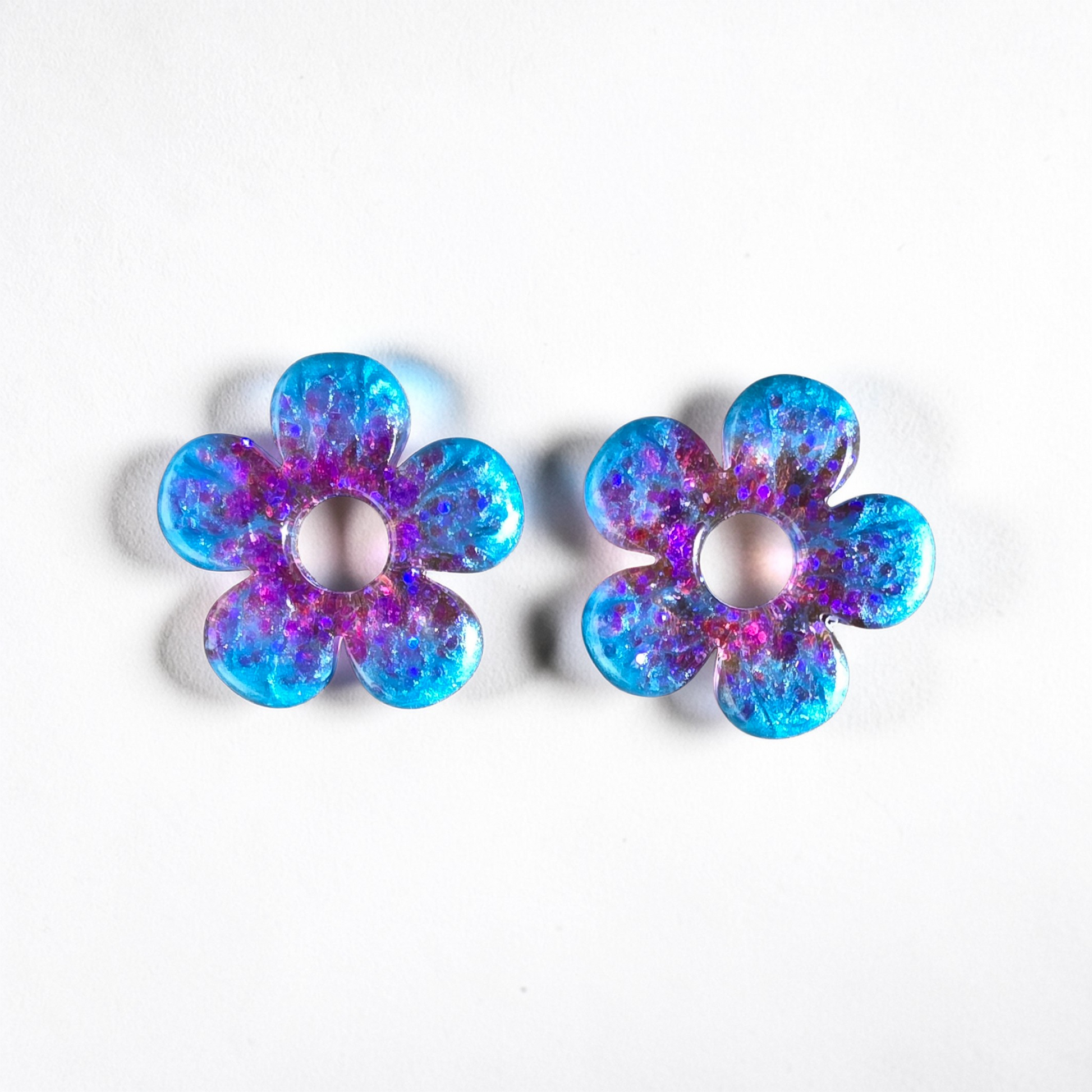 Eclatantes et captivantes, les boucles d’oreilles LED ZEPPLINE se déclinent ici dans un dégradé vibrant de turquoise lumineux et de violet profond, ponctué de paillettes scintillantes. Leur forme fleur ajourée à cinq pétales, avec le trou central signature, offre un design moderne qui met en valeur les jeux de couleurs et de lumière.