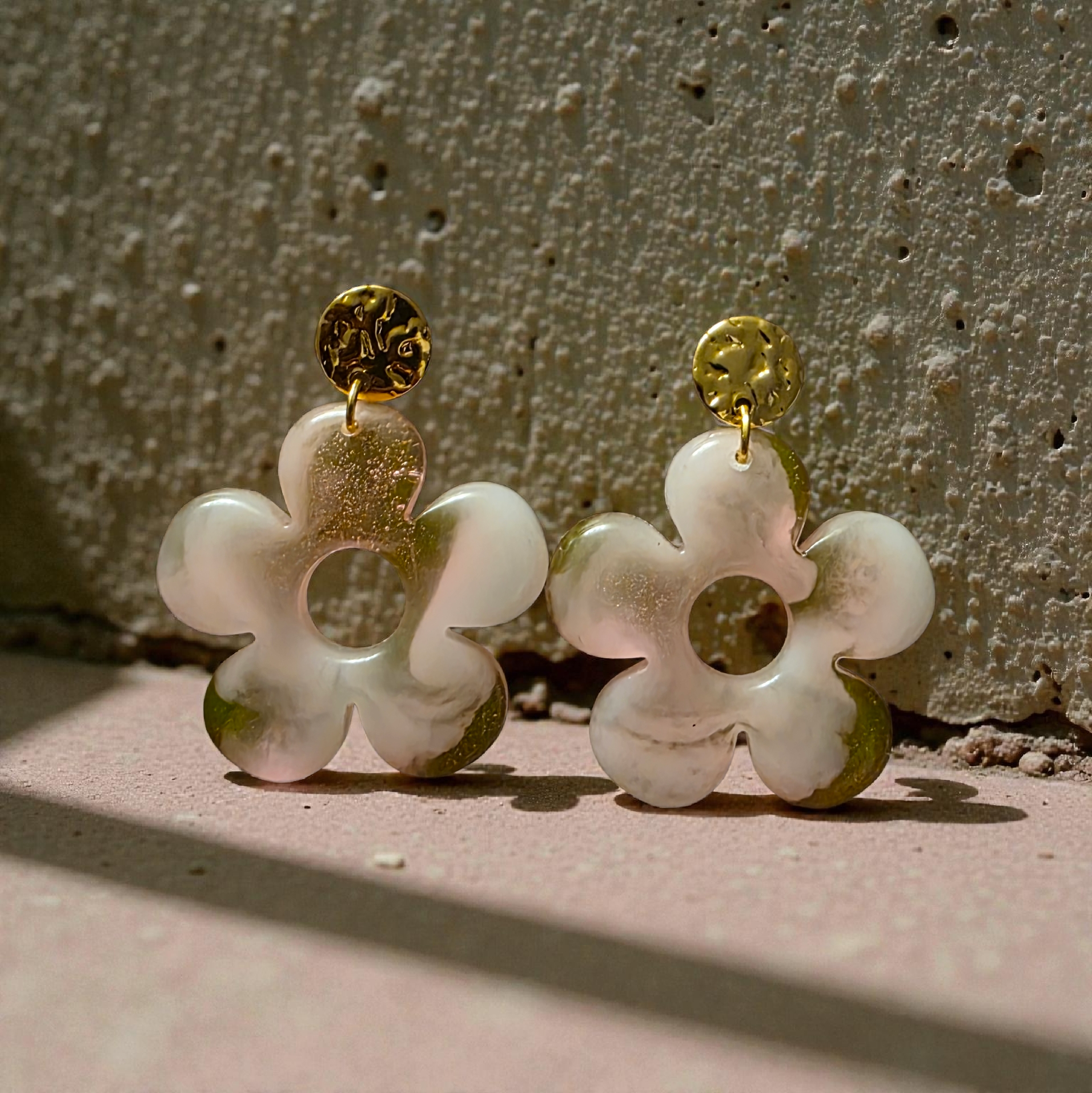 Soft and luminous, the ZEPPLINE LED earrings are distinguished by their openwork floral shape with five petals and their delicate pearly white hue subtly marbled with pink. Their slightly translucent finish elegantly captures the light and adds a fresh, natural, and refined touch to your style.