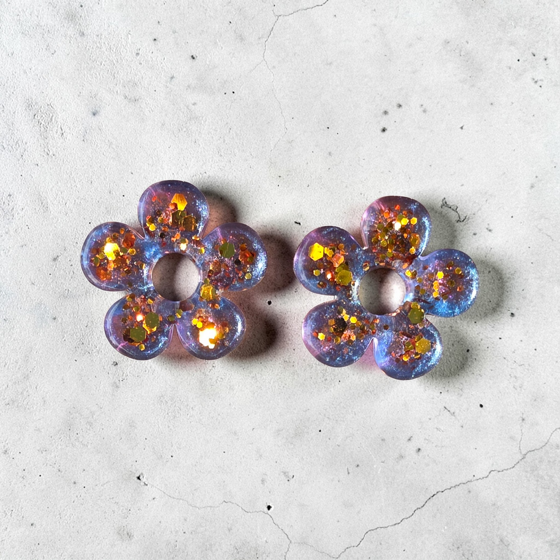 La forme fleur ajourée à cinq pétales, avec son trou central signature, met parfaitement en valeur ce contraste entre la profondeur froide du violet et la chaleur éclatante des paillettes dorées.