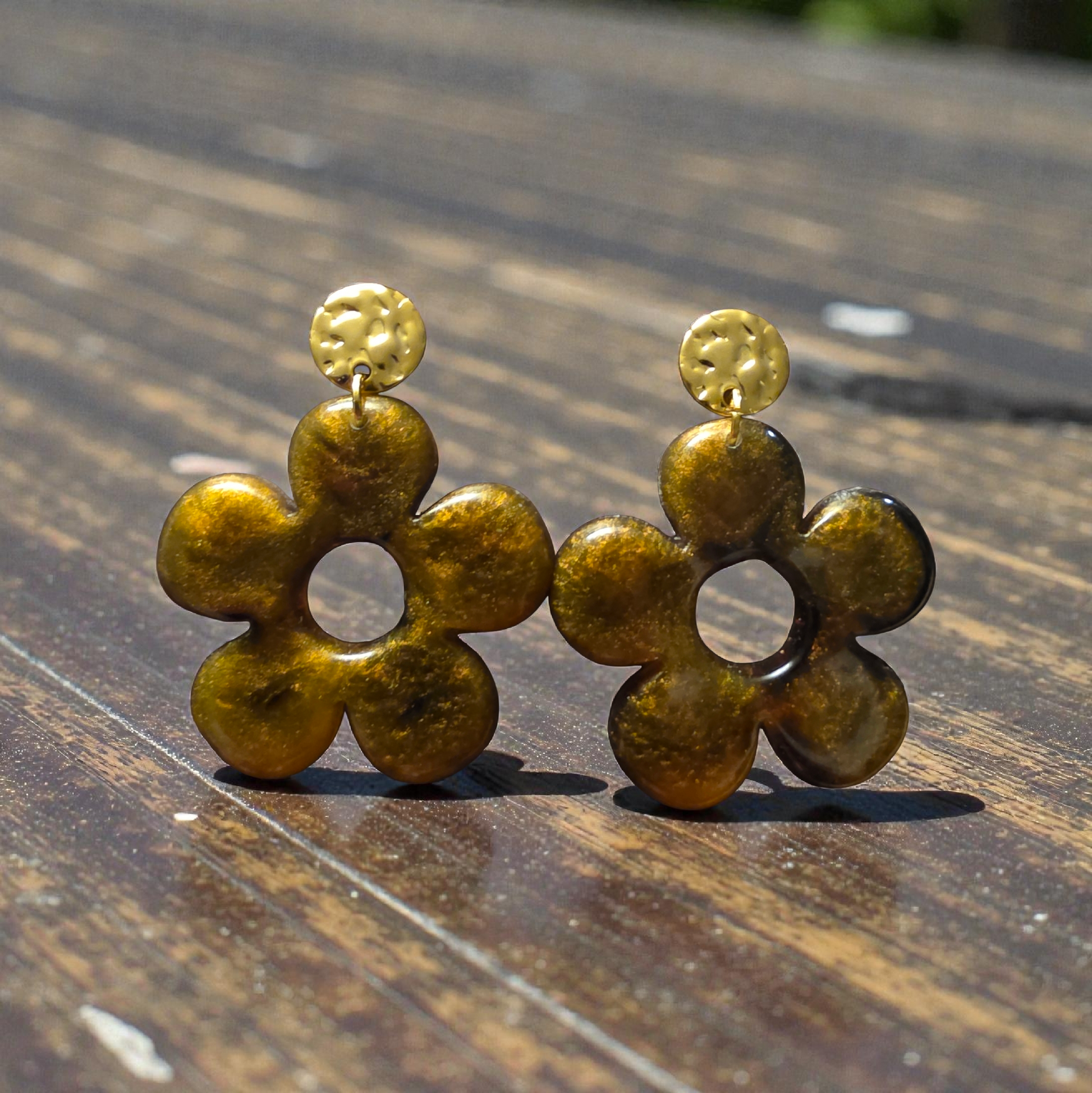 Warm and inviting, the ZEPPLINE LED earrings are distinguished by their openwork, five-petal floral shape and their subtly satiny, golden bronze hue. Their slightly marbled finish elegantly captures the light, adding a natural and refined touch to your style.
