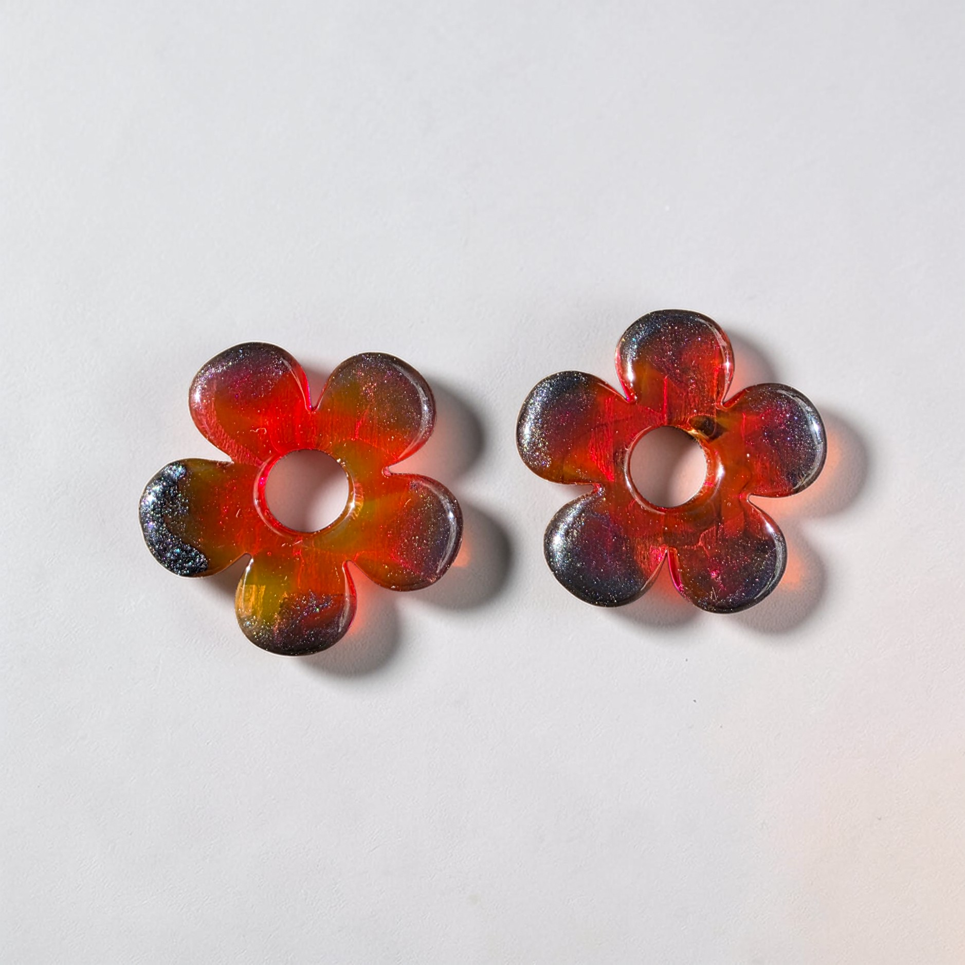 La transparence de la résine laisse passer la lumière, ce qui accentue l’effet “glow” naturel de la pièce. Le contraste entre la chaleur du rouge/orangé et la profondeur des bords plus sombres crée un équilibre puissant et moderne.
