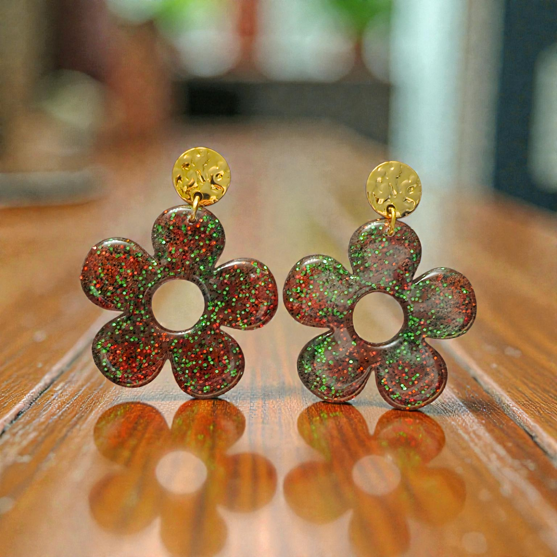 Original and luminous, the ZEPPLINE LED earrings stand out with their openwork floral shape featuring five petals and a blend of red and green glitter with shimmering reflections. Their subtle transparency, enhanced with multicolored touches, captures the light intensely and adds a festive and bold touch to your style.