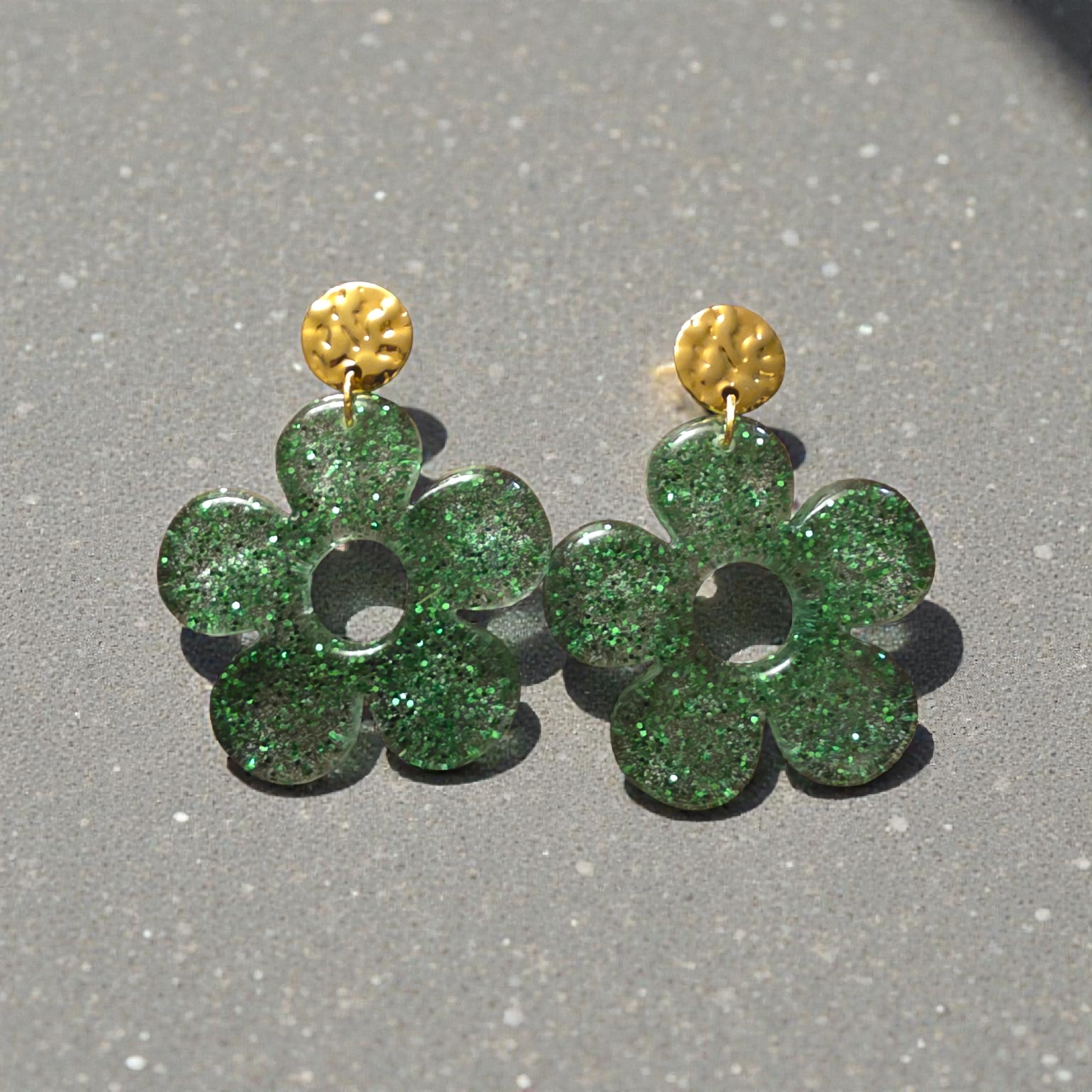 Fresh and luminous, ZEPPLINE LED earrings stand out with their openwork floral shape featuring five petals and an intense green hue with shimmering reflections. Their subtle transparency, enriched with fine, sparkling glitter, captures the light brilliantly and adds a natural, vibrant touch to your style.