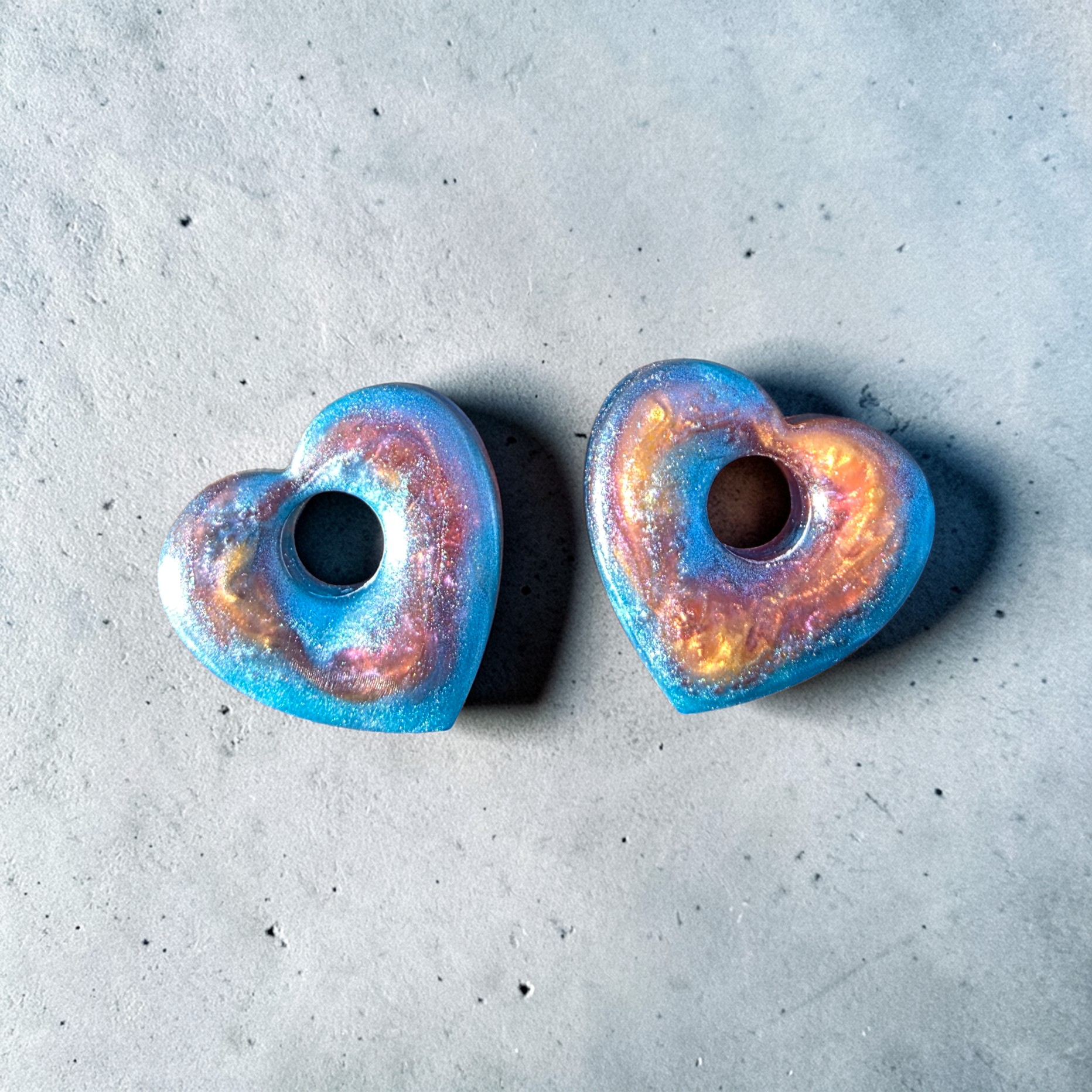 La résine crée un effet presque cosmique, comme une nébuleuse capturée dans un cœur. Les reflets nacrés évoluent selon la lumière, offrant profondeur et intensité. La forme ajourée centrale apporte modernité et légèreté à l’ensemble.