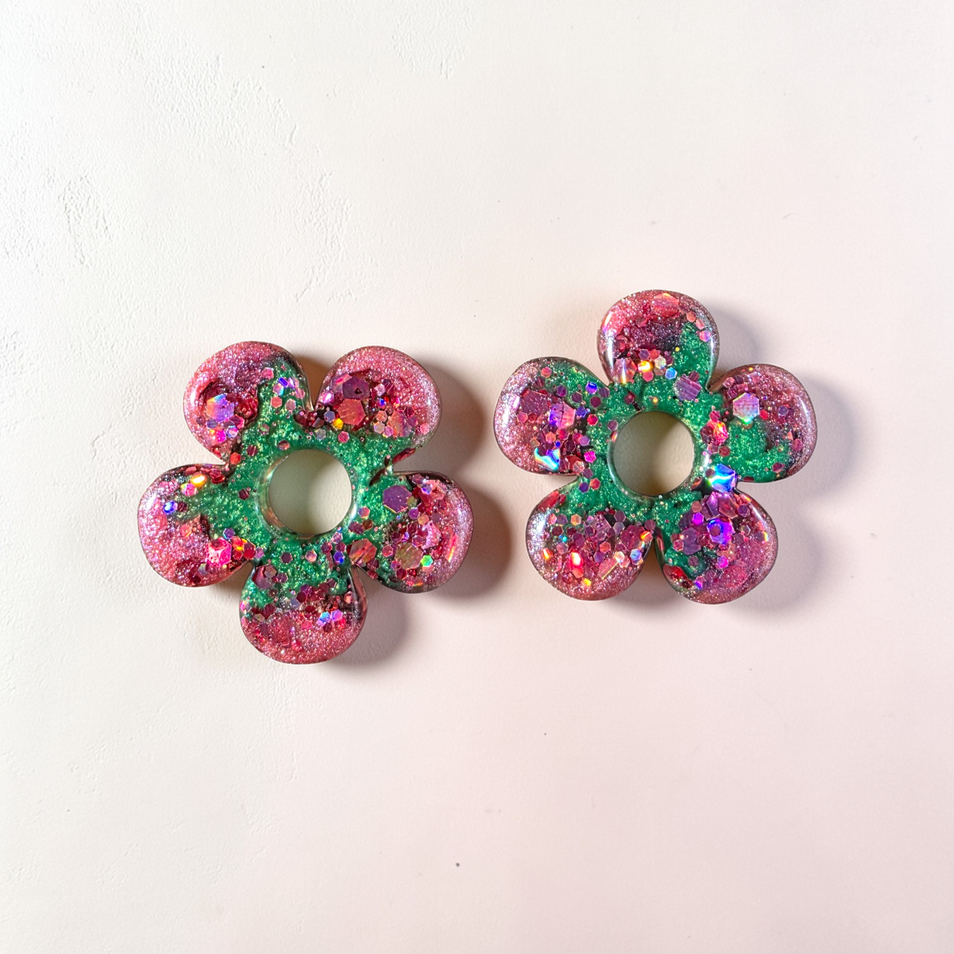 Le centre vert intense contraste magnifiquement avec les pétales rose éclatant, le tout enrichi de paillettes et de fragments irisés façon confettis. Chaque détail capte la lumière différemment, ce qui rend chaque paire unique et vivante.