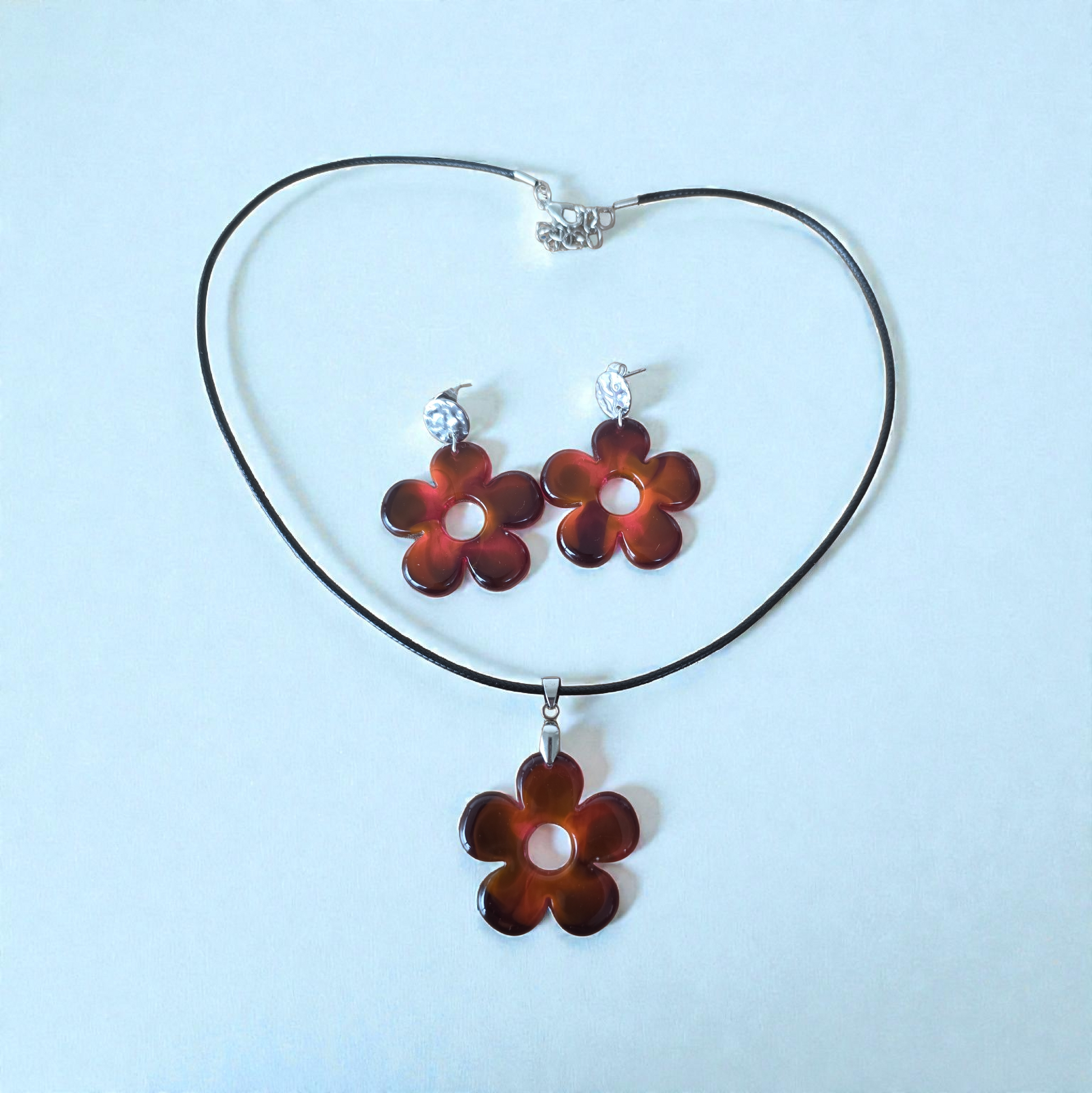 Chaleureuse et élégante, la parure LED ZEPPLINE se distingue par sa forme florale ajourée à cinq pétales et par ses nuances profondes de brun ambré, caramel et reflets écaille subtilement fondus. Sa finition brillante capte délicatement la lumière et apporte une touche sophistiquée et intemporelle à la silhouette.